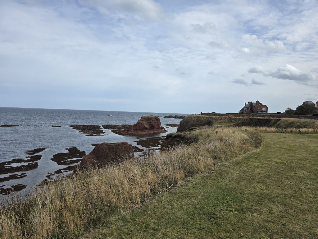 Von Newcastle aus fuhren wir über die Grenze zu Schottland auf der A1 nach Dunbar, wo wir mit den Hunden am Steilufer spazieren gingen. Dunja kletterte mit Oromeh hinunter zum Strand, aber ich blieb mit Liathrigh lieber oben auf der Promenade und ließ mir die frische Brise um die Nase wehen.